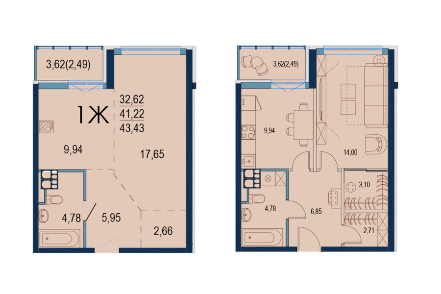 Готовая однокомнатная квартира 1Ж , площадью 43,7 кв.м., расположенная на 14 этаже в Доме №2. Стоимость 2150 долларов США за квадратный метр.